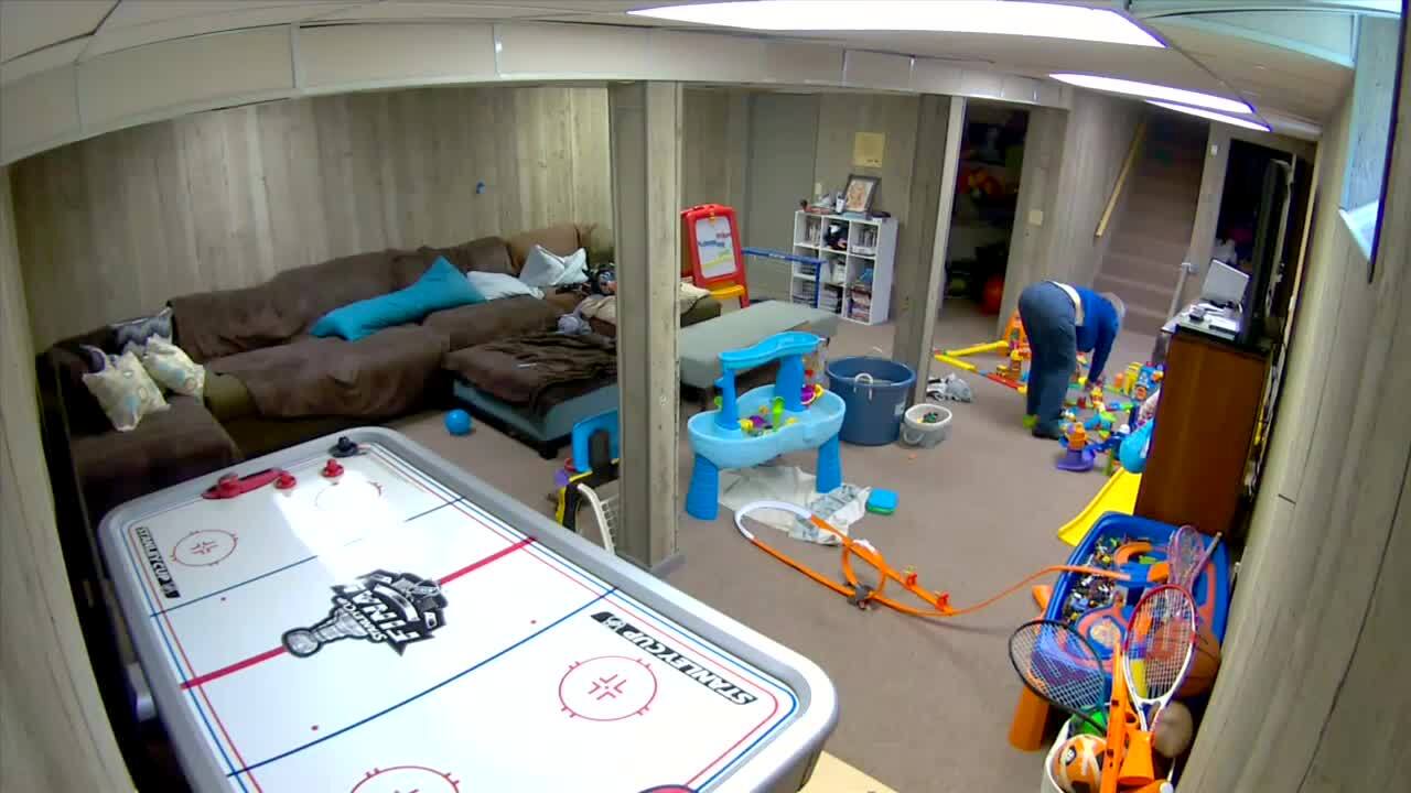 Security camera footage of a man who falls head first in to a garbage bin when he slips and it falls over in the backyard. No sound.