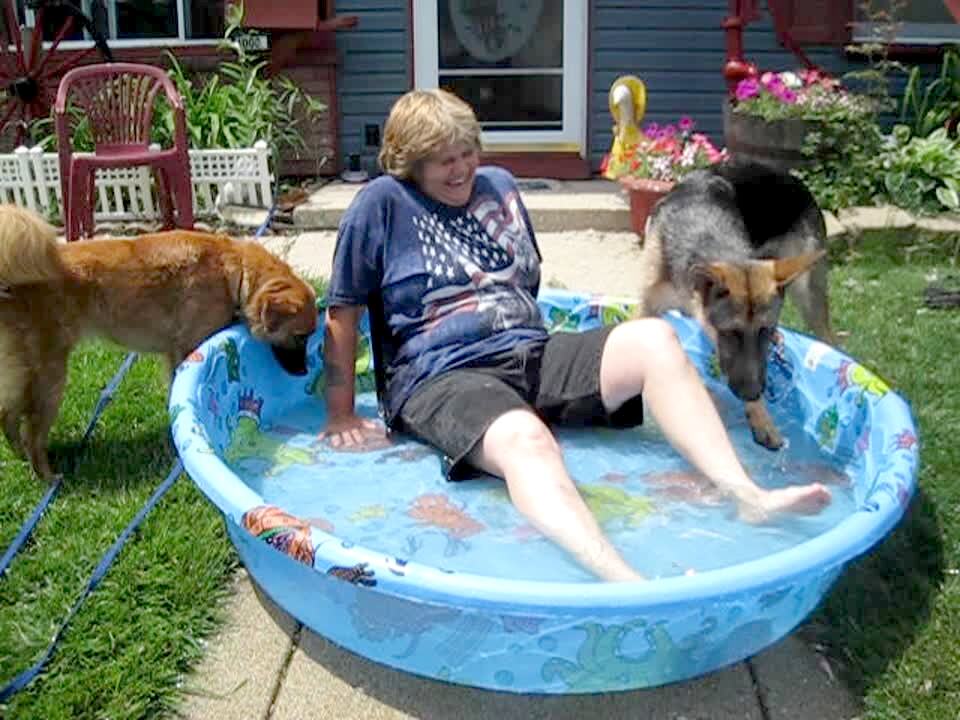 A woman climbs into an inflatable kiddie pool in a driveway and trips and falls. Security footage.