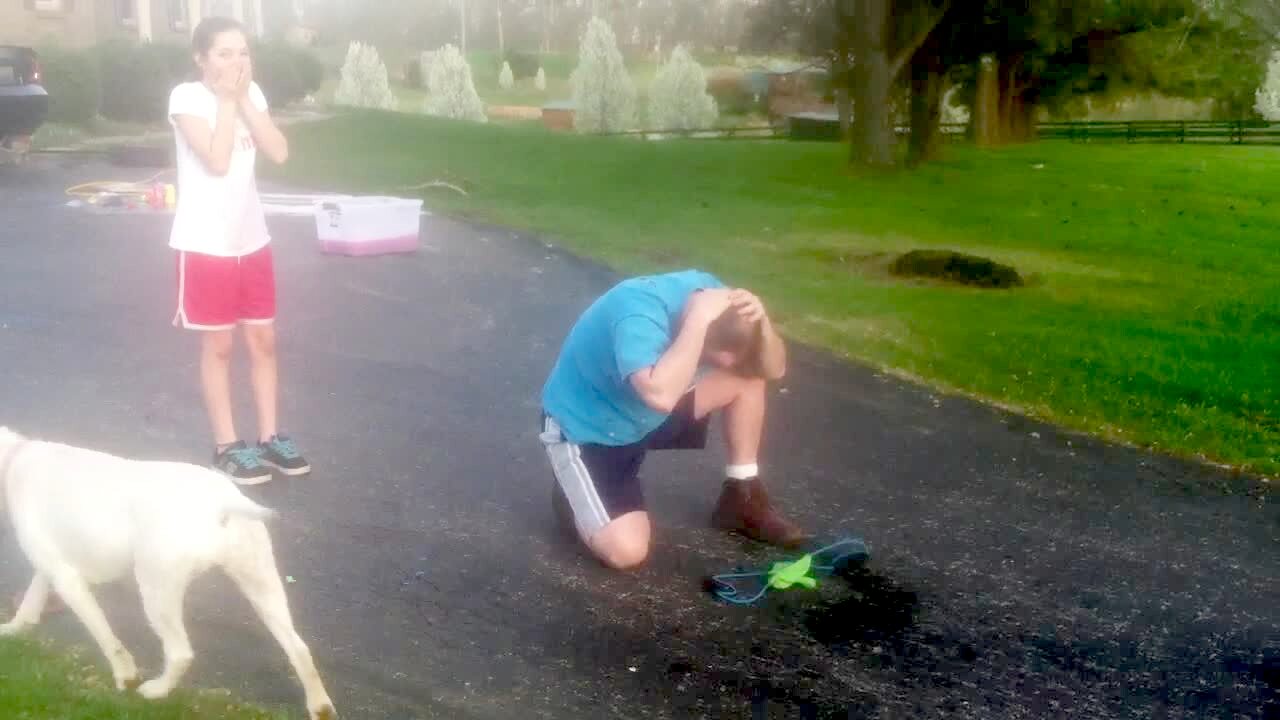 A man hurts his head and knocks his hat off when a teen girl fires a water balloon from a slingshot the man holds outdoors. A woman is audible. A Lab dog is visible.