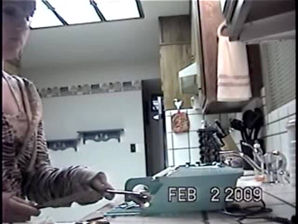 A woman sits in a chair in the living room and makes animal noises. Her cat jumps up at her, and the woman screams and knocks the recliner backwards and onto the ground. Security footage.