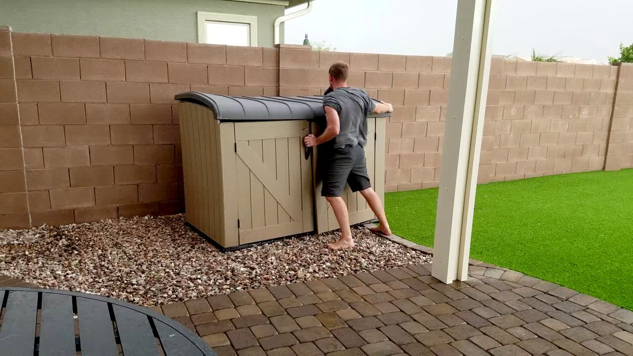 A cat hides in a box and jumps out and scares another cat when it walks into the room. Then they fight and play and roll around. Home security footage.