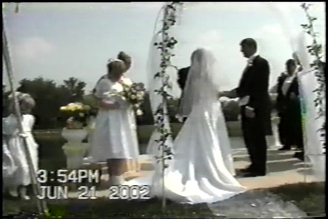 A bride throws her bouquet in a swimming pool and three women jump in after it. One gets it and raises it into the air at :25. Another shows the camera her bloody knee at :49.