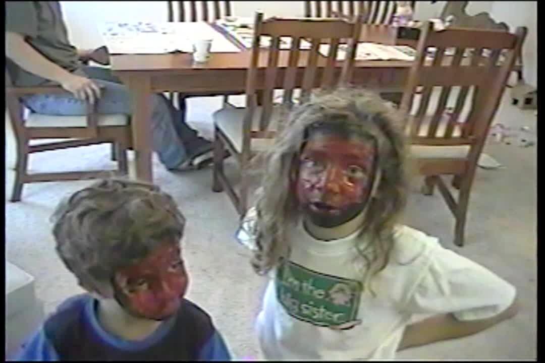 Boy & girl paint their faces red & black & tell their mom that they have monkey faces. Mess.