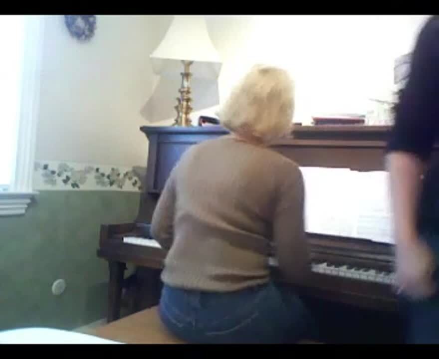 Mom and daughter sit at piano and then switch places. Daughter falls out of frame and Mom laughs uncontrollably. Both are women.