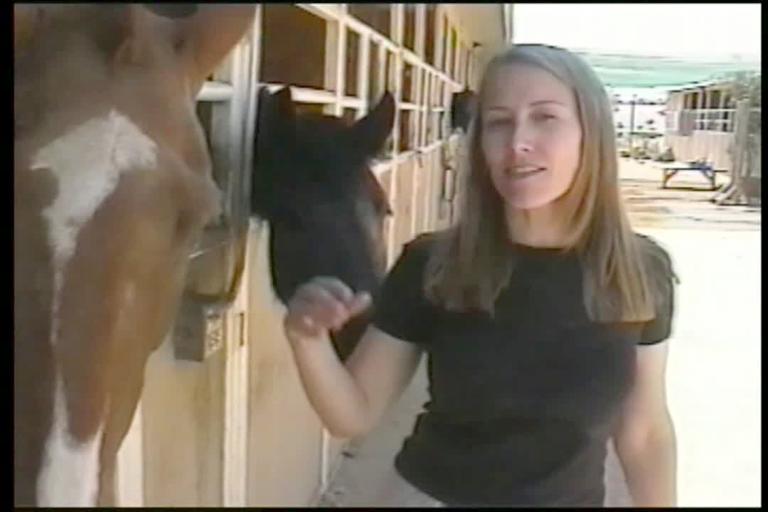 Horse tied to stable fence jumps back, pulls wood board off, it hits woman & knocks her down. Outdoors, barn, farm.