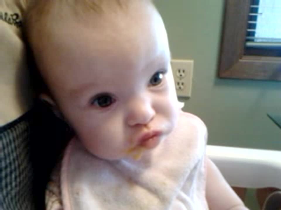 Baby girl eats baby food and makes a funny face. She squishes & gurns her face, puckers her lips. First foods.