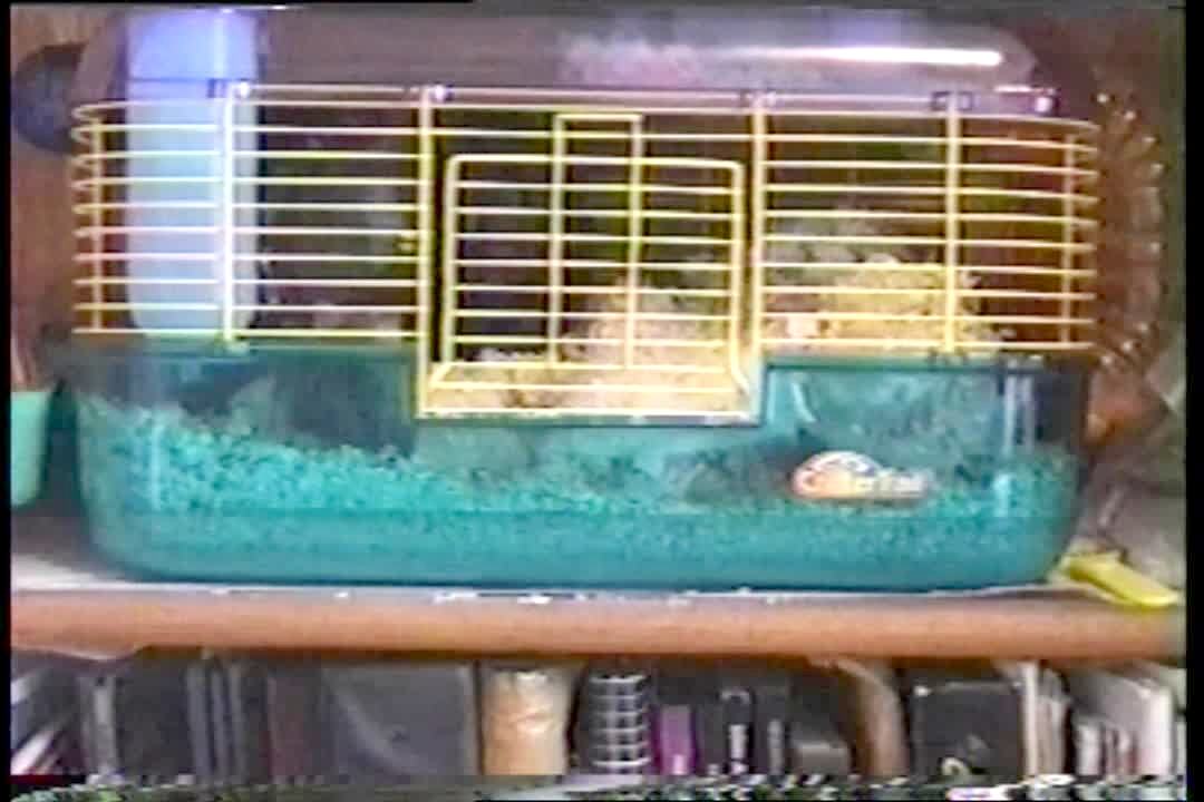 Hamster climbing on cage door falls out of cage to the ground when the door opens.( 1401, 2117M)