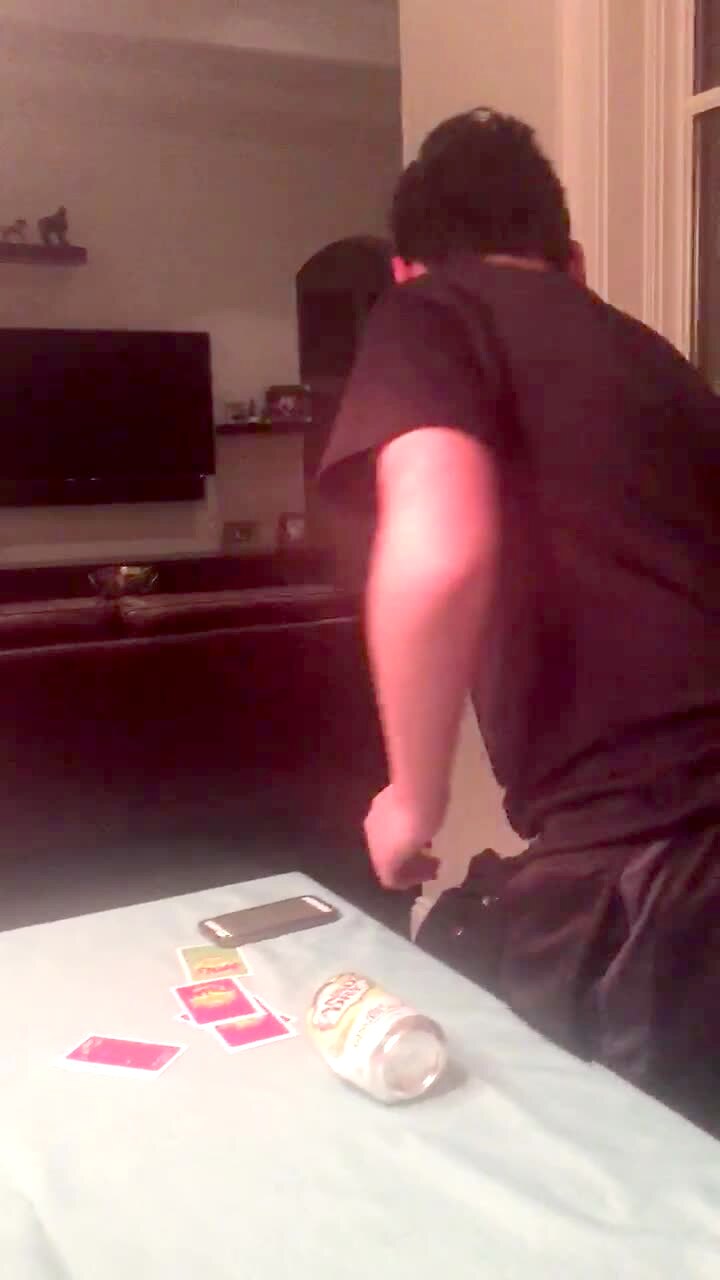 A boy attempts to headbutt a can of soda on the kitchen table indoors but the can moves so he hits his head on the table.