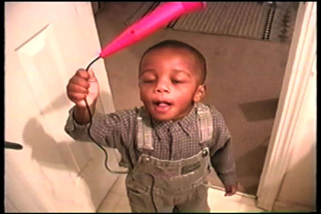 A tot boy with snorkel goggles on his forehead struggles to find his goggles and when his mom tells him he has to find them to go inside, he puts his hand on his forehead and whines, then realizes that's where his goggles are.