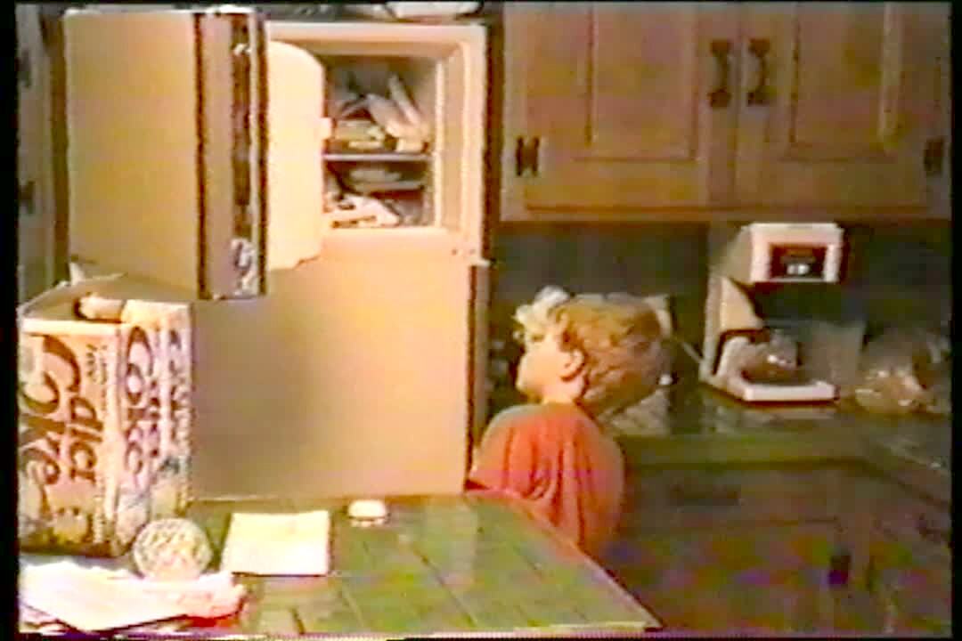Young red head boy opens fridge, takes out popsicle, jumps up and hits head hard