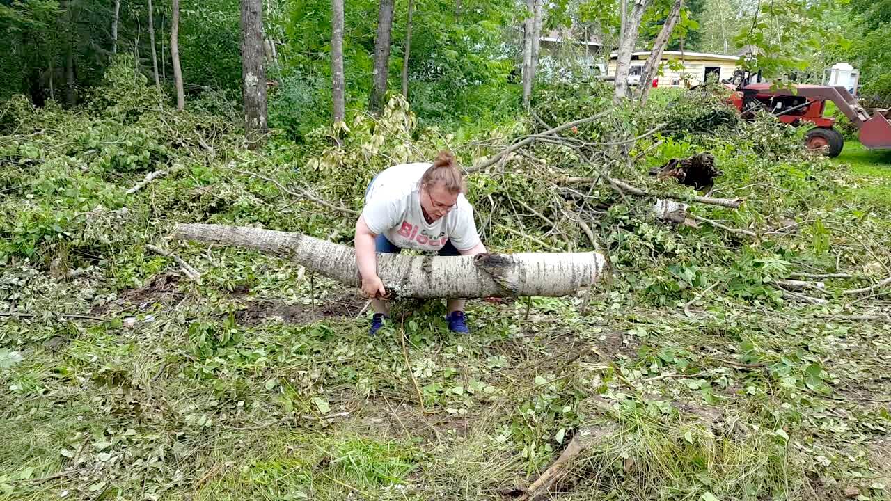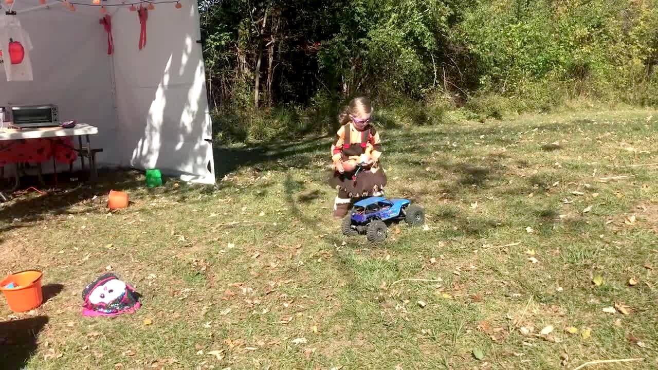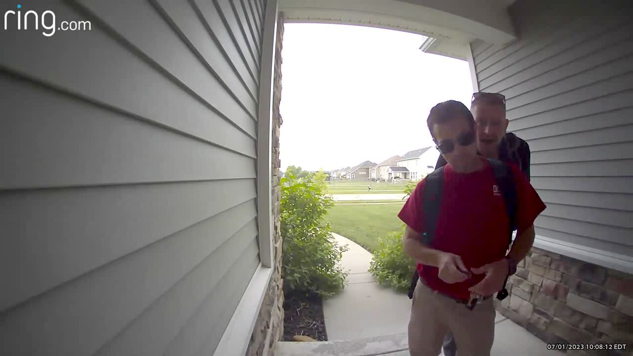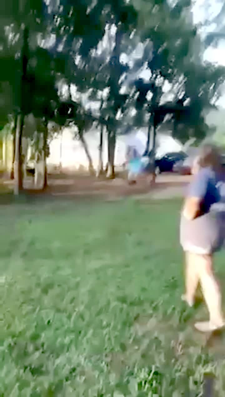 A man and a teen girl do a TikTok dance and he tries to roll across her back but they both fall to the ground in the backyard. Music rights not cleared.