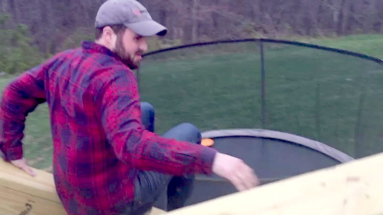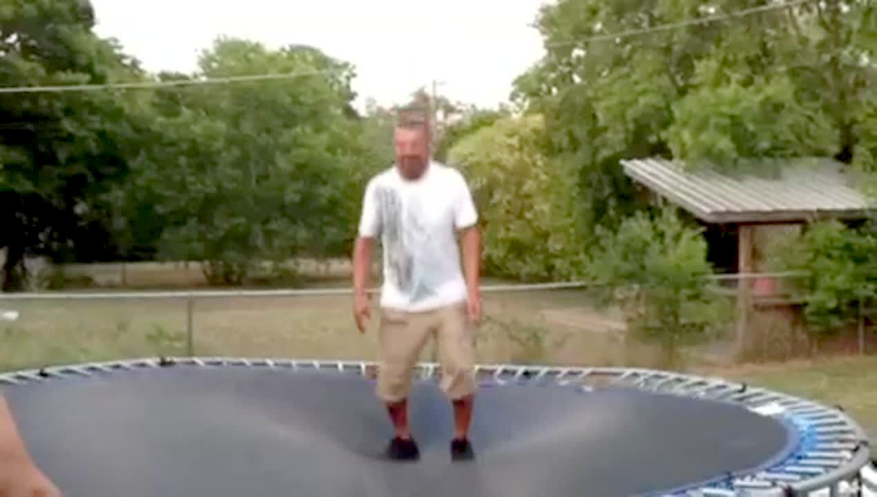 Man jumps on mini-trampoline, hits hard, breaks through ceiling.