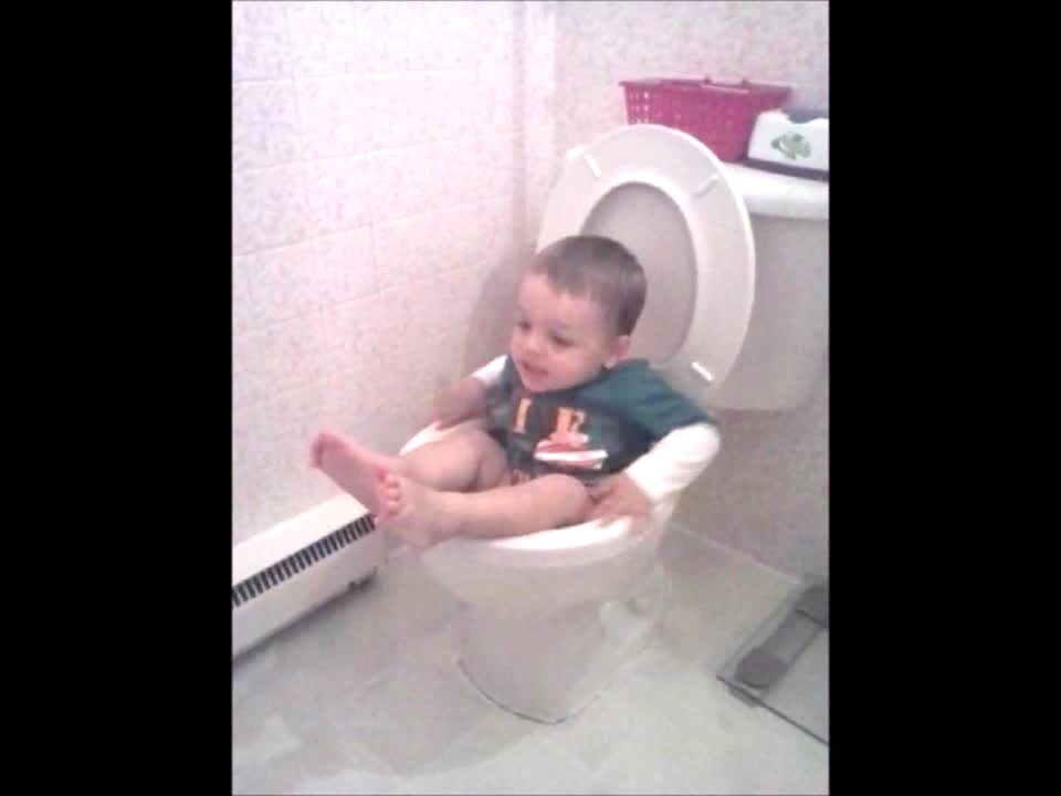 Tot boy is stuck inside a toilet bowl. He cries. Bathroom.