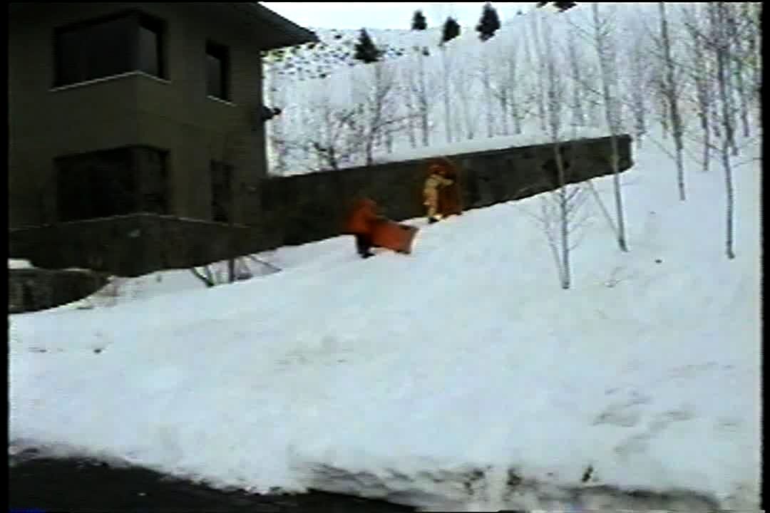 Teen boy sleds down a snow covered hill in a large bucket. He crashes, falls out of the bucket, and the bucket flies up, hits another teen boy walking up the hill, and knocks him down to the ground. Winter.