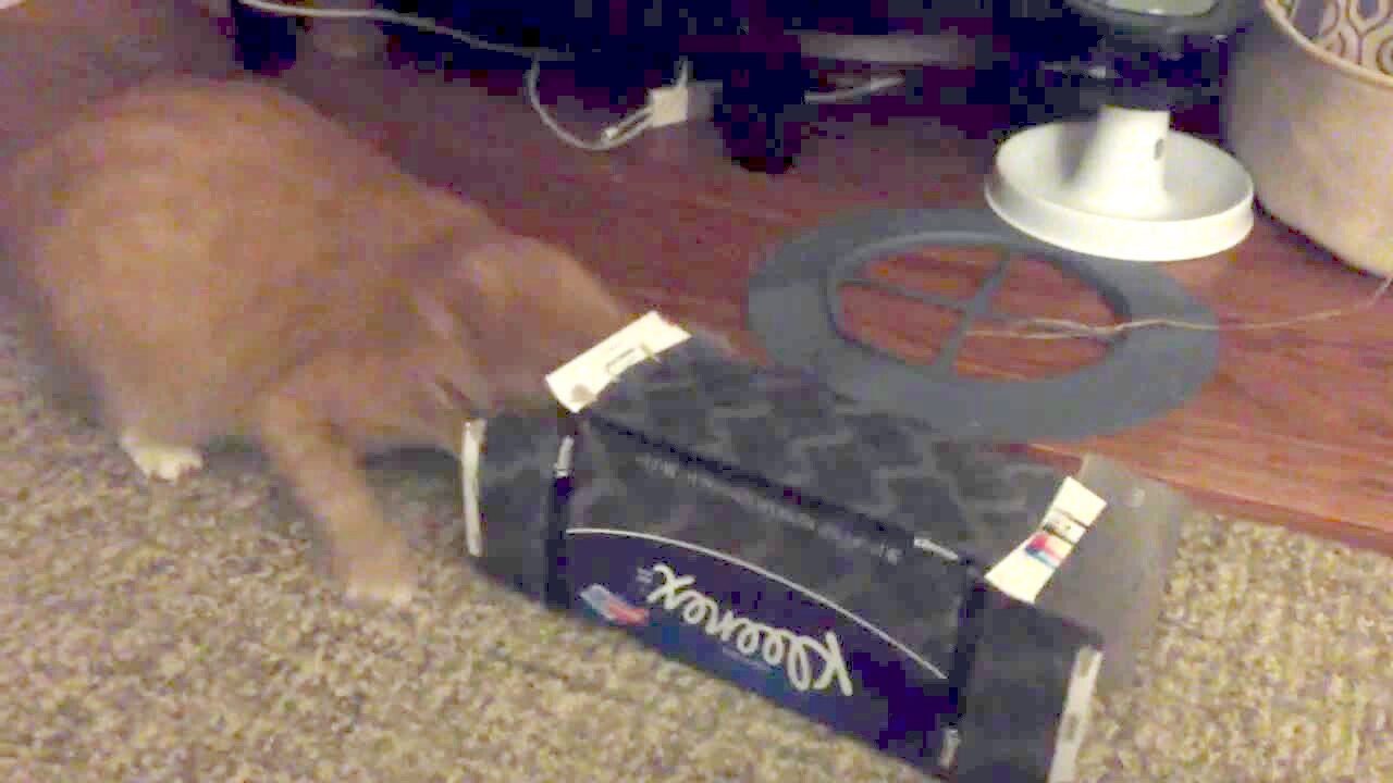 Cat has a tissue box stuck on its head and falls off the table in the den. No recovery.
