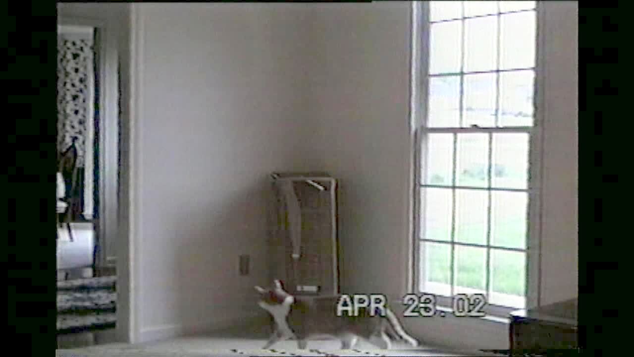 A cat lays inside of a flat cardboard box in a living room. At :17, a dog walks on top of the box and the cat runs out of the box with a worried expression.