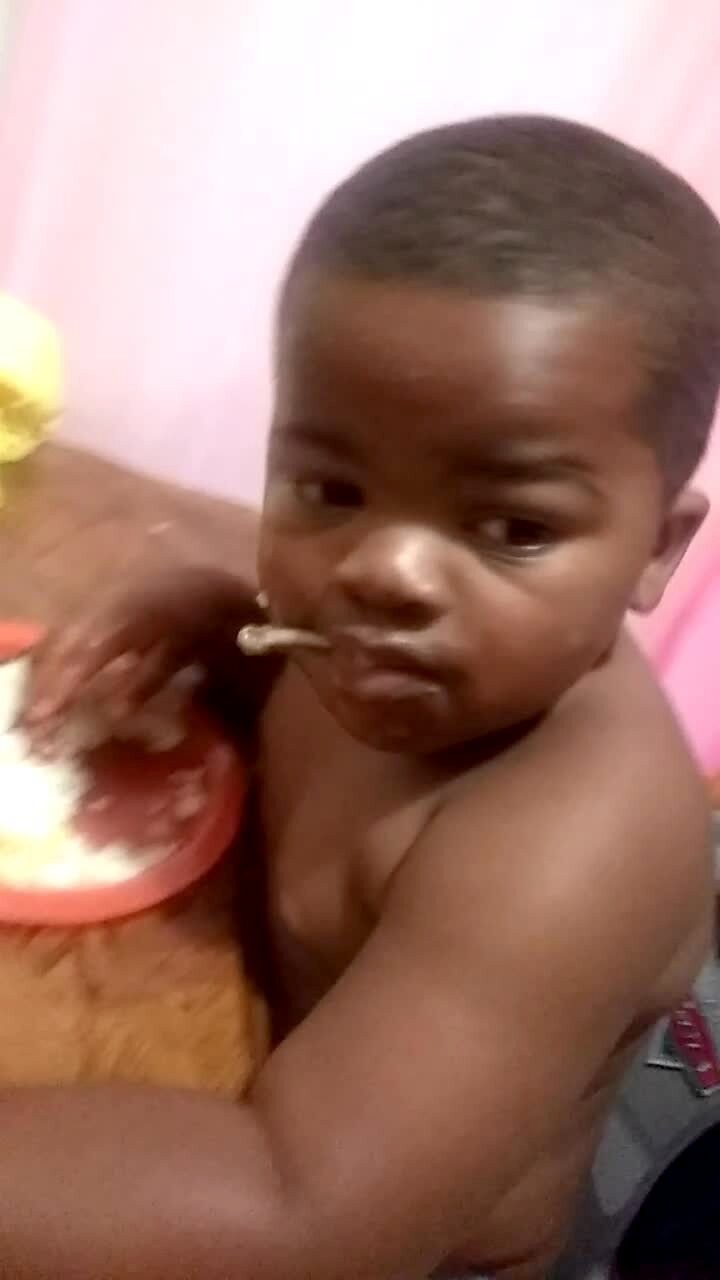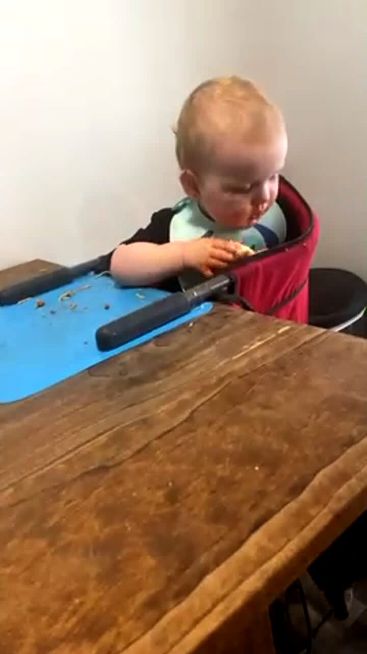 A tot boy whines in a high chair until his father holds a brownie in front of him and the camera and he says, "ooh" with his eyes and mouth wide open.