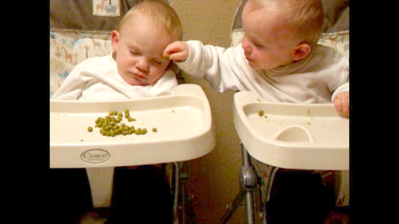 A baby boy sleeps in a high chair and his twin brother steals peas off his food tray and eats them.