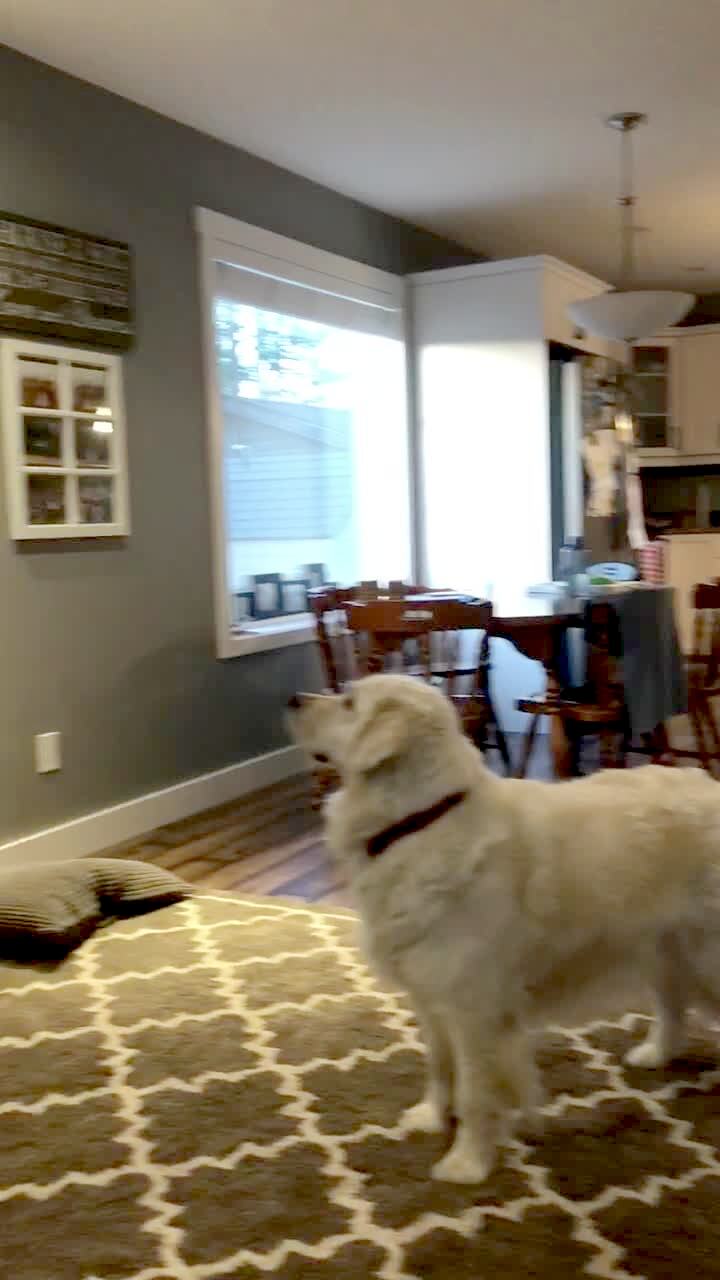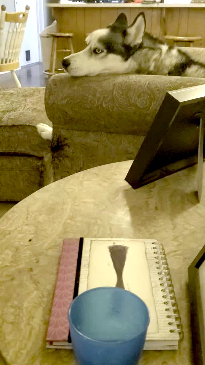 A Siberian Husky dog howls when a woman calls another dog's name in the living room.