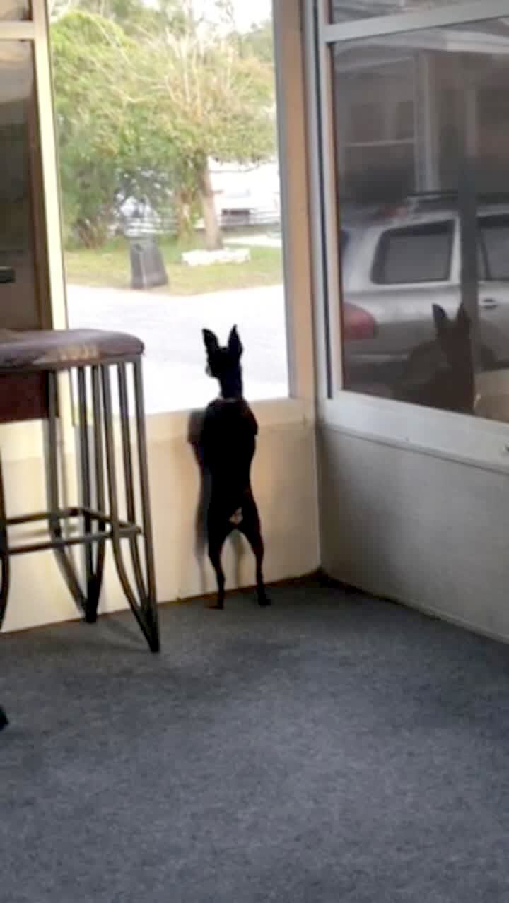A dog stands on her hind legs and looks out of a window. She then walks back and forth between two windows on her hind legs.