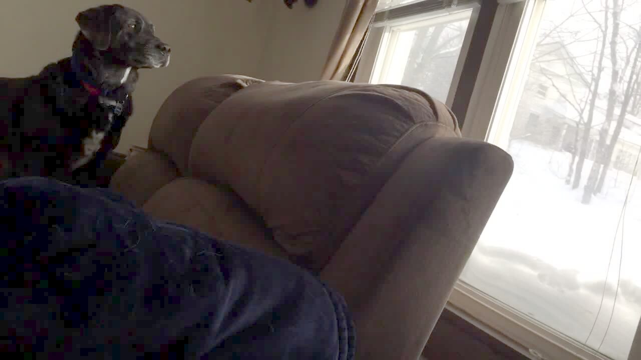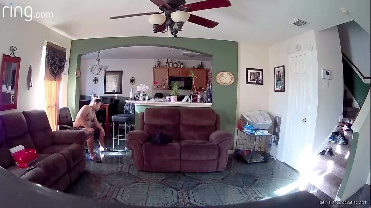 A man sits in a living room and watches a puppy dog walk around a living room. Around 0:30 the puppy dog squats to poop on the floor and the man gets up and runs over to the dog and runs with the dog to take it outside and he trips and falls and crashes into a stool and knocks it over. Security camera.