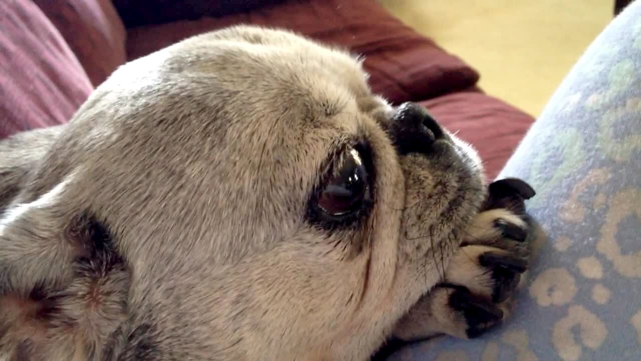 2 pugs tilt their heads when man whistles off-camera. Shot from above the dog's heads. Long for edit.