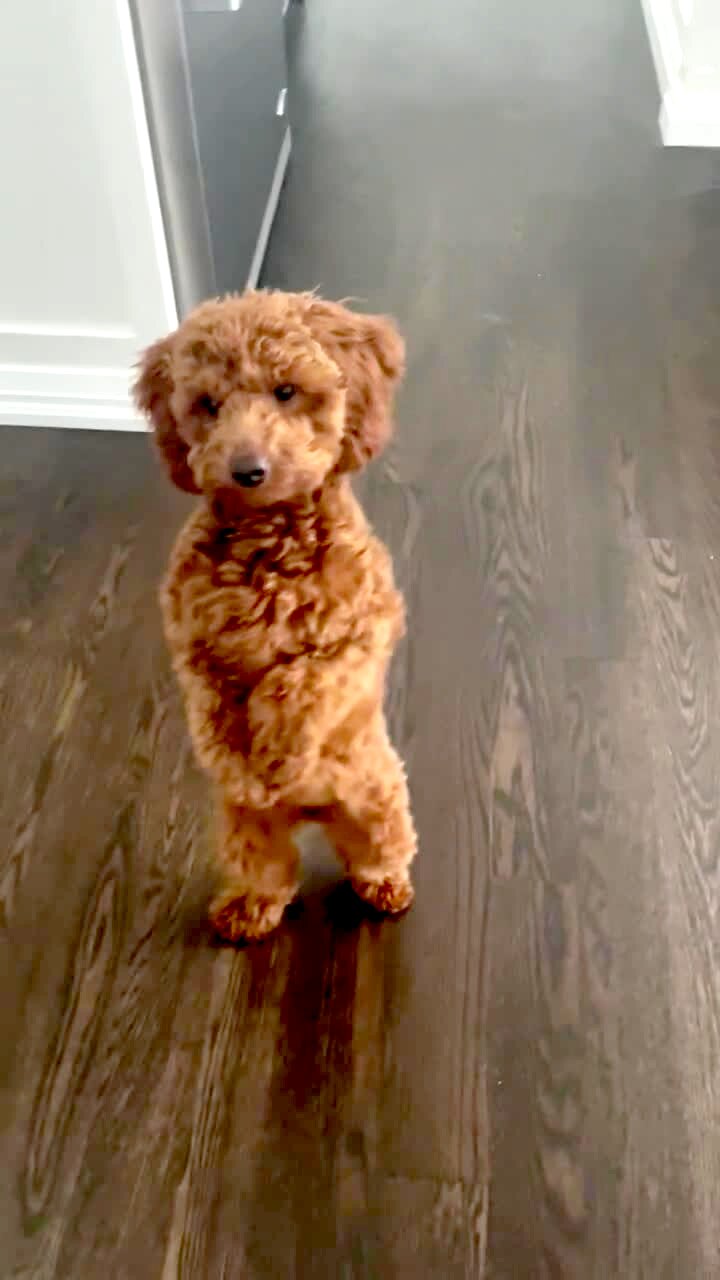 A dog leans on kitchen table and wants more snacks then walks on its hind legs towards camera to beg for food.
