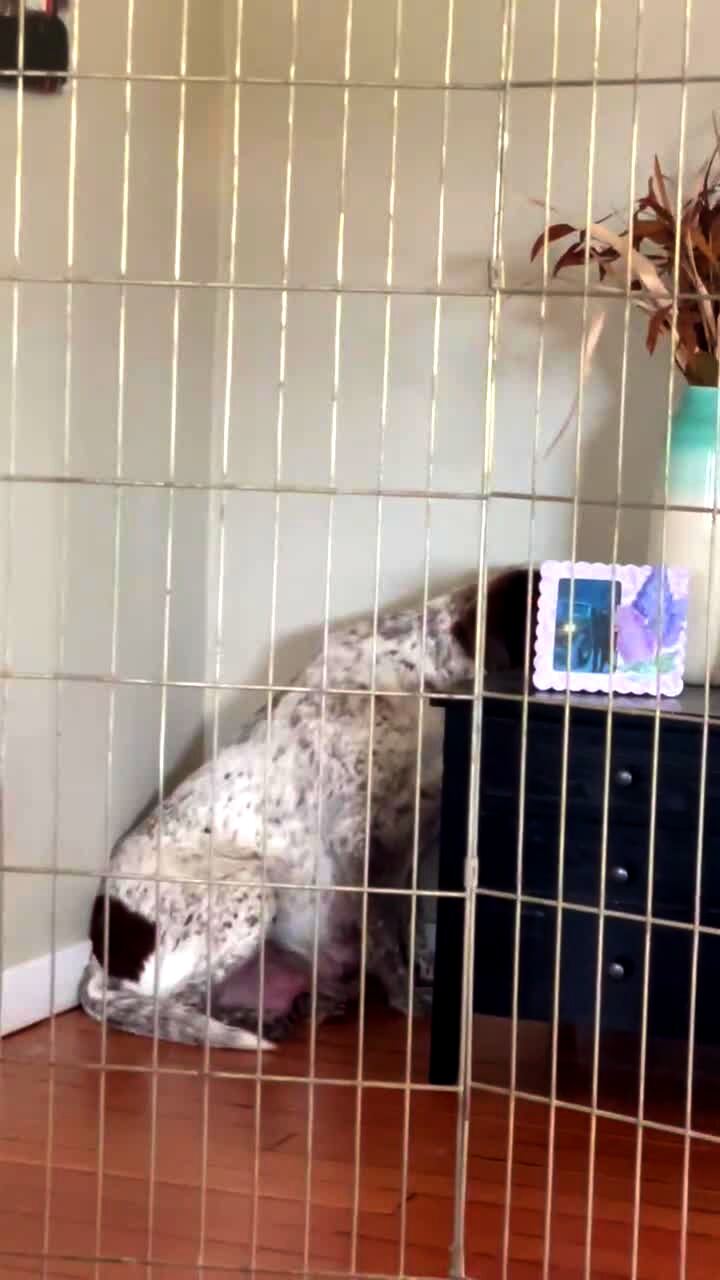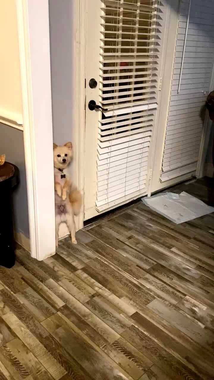 A woman tells her Pomeranian dog to get in the corner, and the dog walks behind a wall and stands on his hind legs.