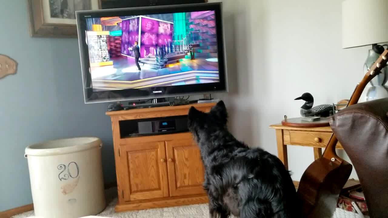 A man and woman yell to their dog that "AFV is on" in the living room, then their dog runs into the room to watch the television and quietly whines.