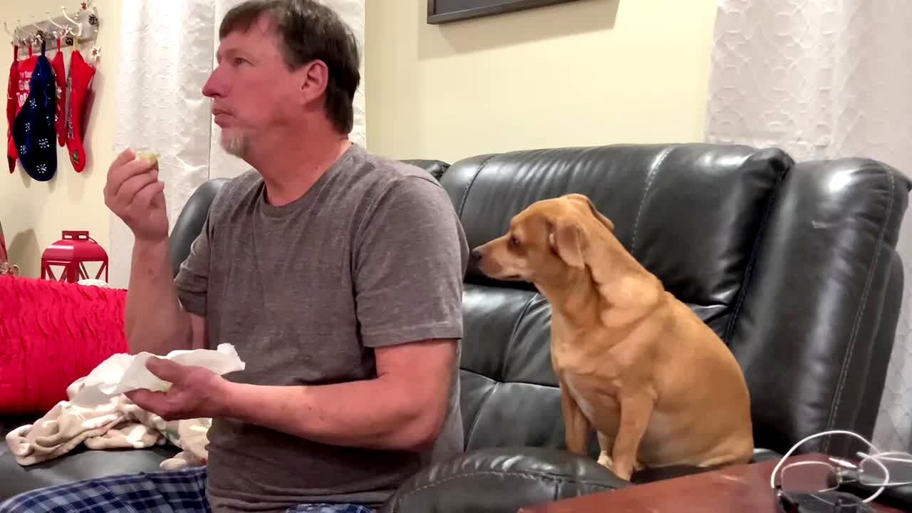 A dog stares at a man as he eats grapes in a living room. Every time the man looks at him, he looks away.