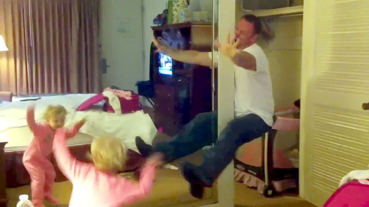 A man uses a mirror to make it look like he's climbing a wall only using his teeth, to entertain a girl tot indoors.