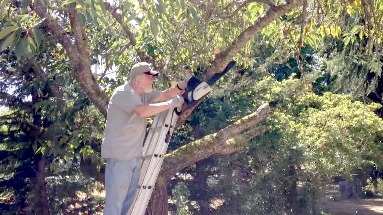 A man stands on a ladder by a fence outdoors as he uses a chain saw to cut down a large tree branch. The branch comes down, knocking over the fence and knocking down the man. Caucasian.