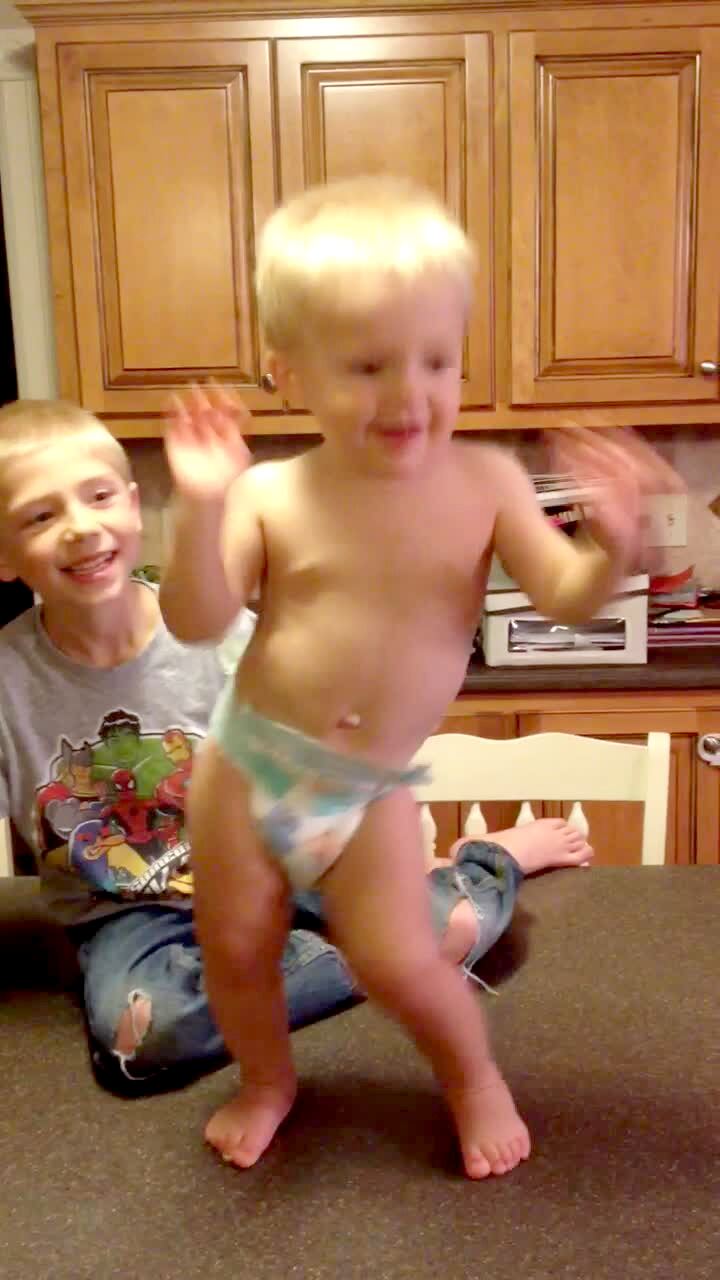 Tot boy with spiky hair bounces up & down dancing to Tom Petty song. Boy stands up hunched over, bouncing on his knees.