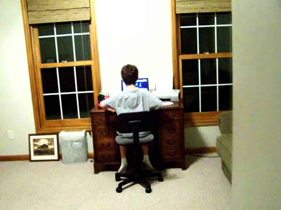 Young boy gets caught dancing in his parents' home office with music on the computer. Is surprised.