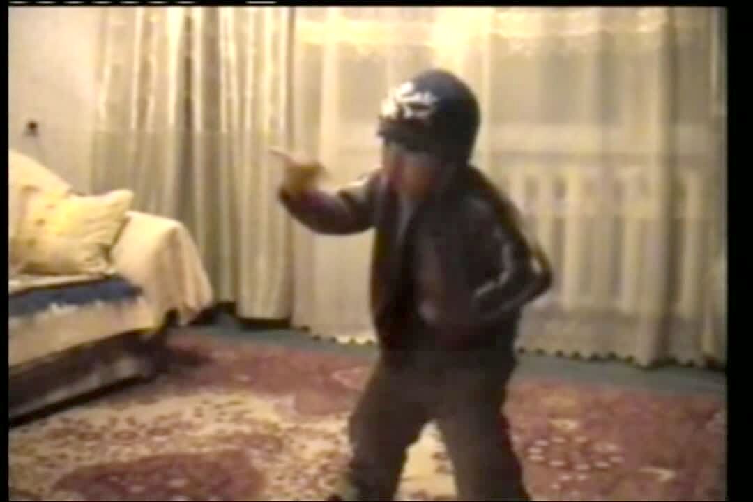Tot boy dressed as rapper dances really well to hip hop music. Wears a track jacket with no shirt underneath.