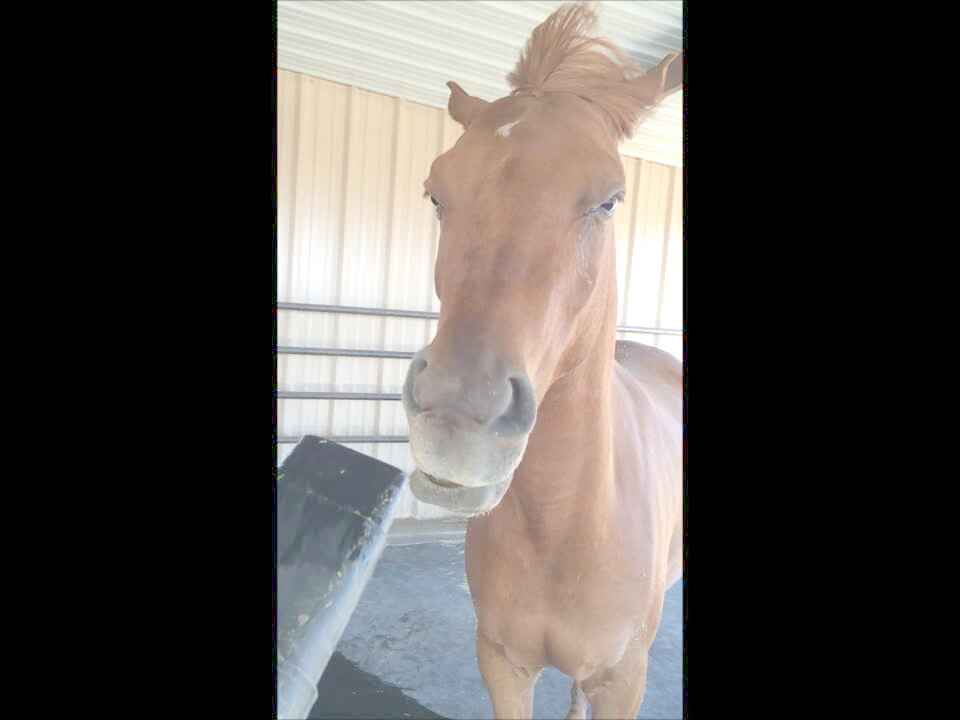 A horse opens his mouth as his owner cools him down with a leaf blower. The blower blows open his lips and cheeks, giving the horse a strange face.