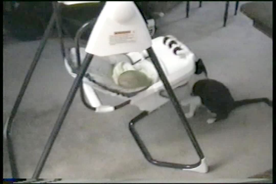 A baby boy sleeps in a carrier in the living room while a cat rocks him back and forth with their paw.