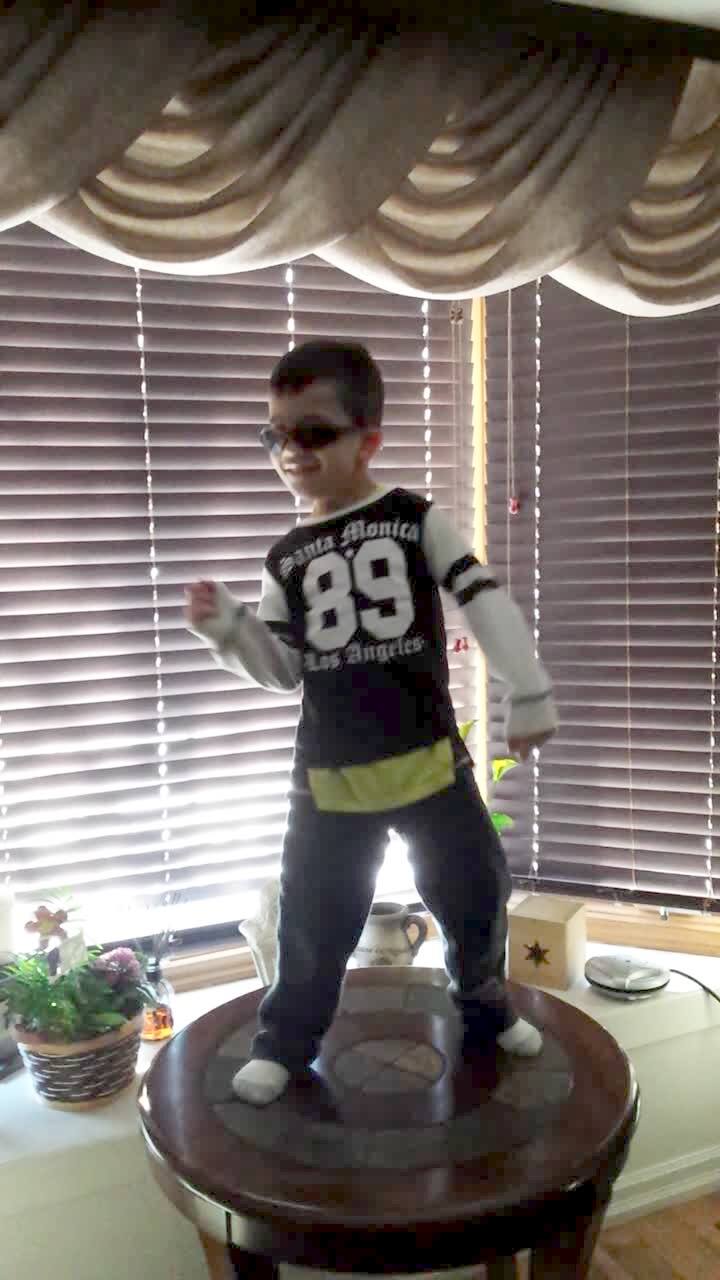Young boy lip synchs and dances in the living room. He knocks over a side table and lamp and says "Whoopsie!"