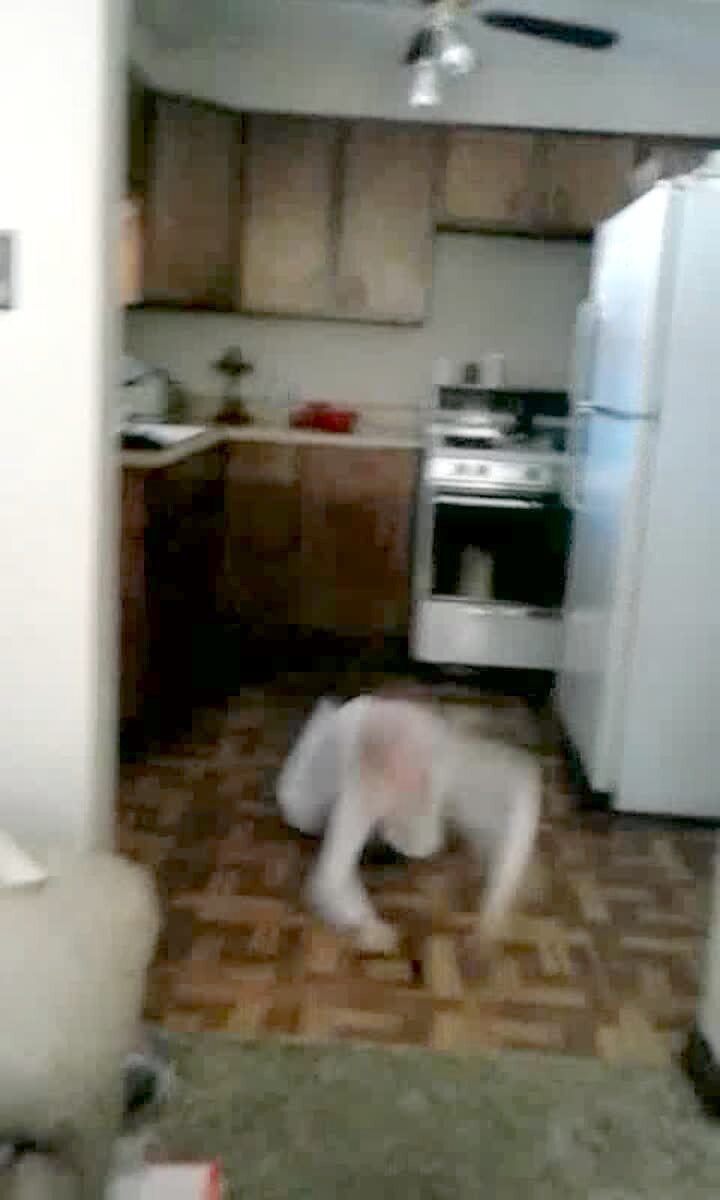 At 1:30 a boy dances to a song indoors when he trips, bangs his face against a table, and falls on the floor.