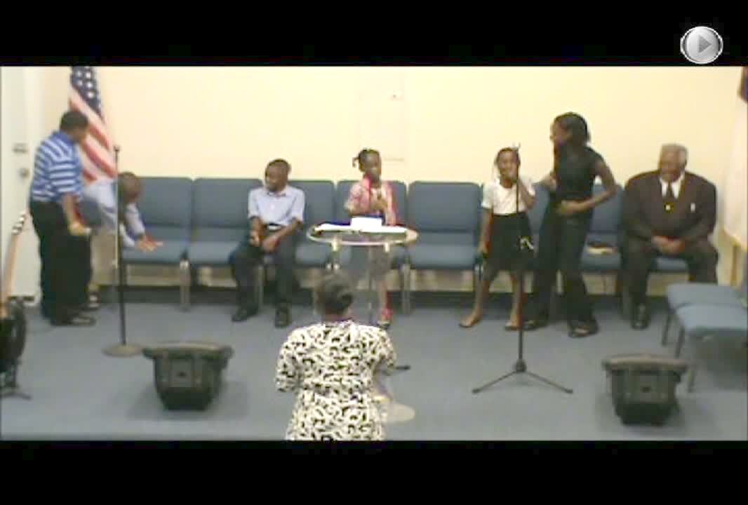 A young boy dances with his classmates during a song at a church and falls over into the American flag at :10. He then slowly gets back up to sing and dance.