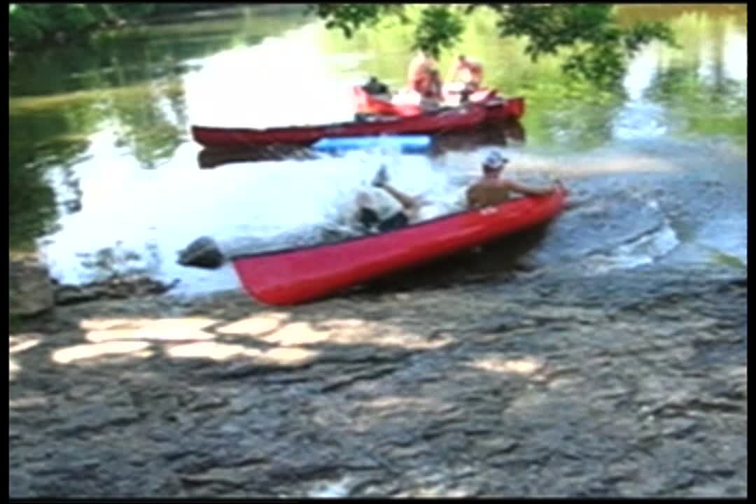 Man in a canoe comes speeding out of the woods, flips over and crashes into the river bed. He lands in the water. With recovery.