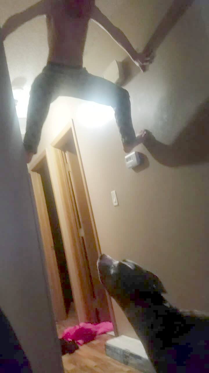 A dog pulls a boy's pants down while he hangs from a pull up bar in the garage.