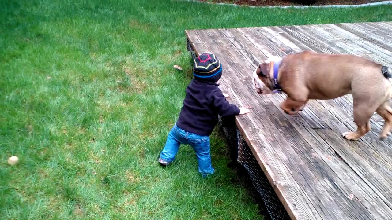 A tot boy runs and a bulldog dog runs and jumps off the porch next to him and tackles him.