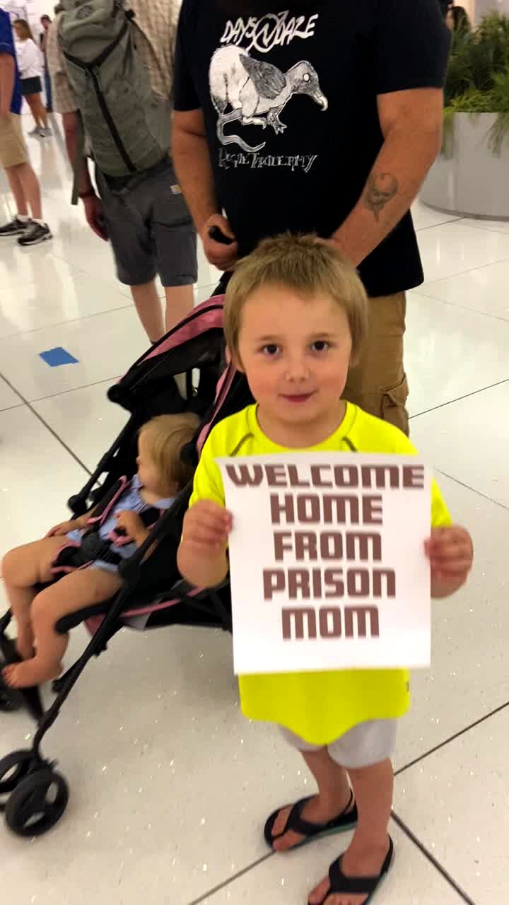 A woman in a kitchen stands on a hoverboard in a kitchen and falls hard and knocks over a young girl.