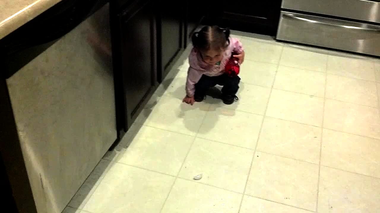 A girl tot tries to pick up ice to put it in a cup in a kitchen. Every time she bends over to pick up ice, more ice falls out of the cup. Cute.