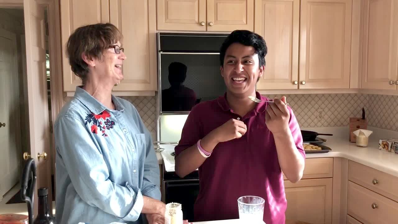 A teen boy chokes on and spits out a spoonful of horseradish onto a group of salads on the kitchen counter after he tries to eat it for a bet.