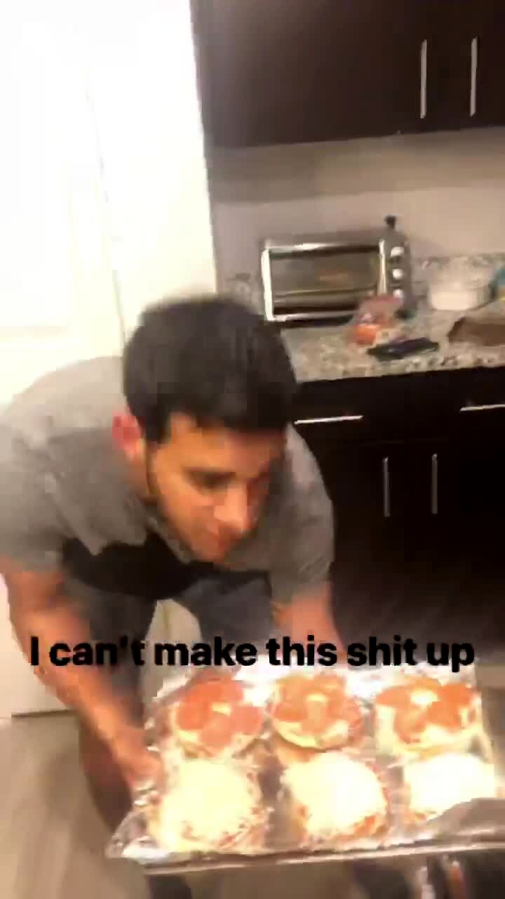 A teen boy calls himself an idiot after three bagel pizza fall when he doesn't put a tray all the way on the rack in an oven. Text edited in to the video that reads: "I can't make this shit up".