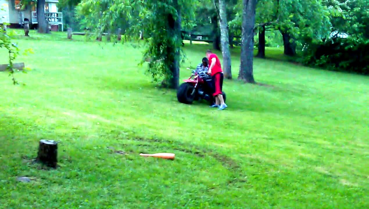 Young man tries to wheelie on a four wheeler and falls forward when he stops. AFV at :27.