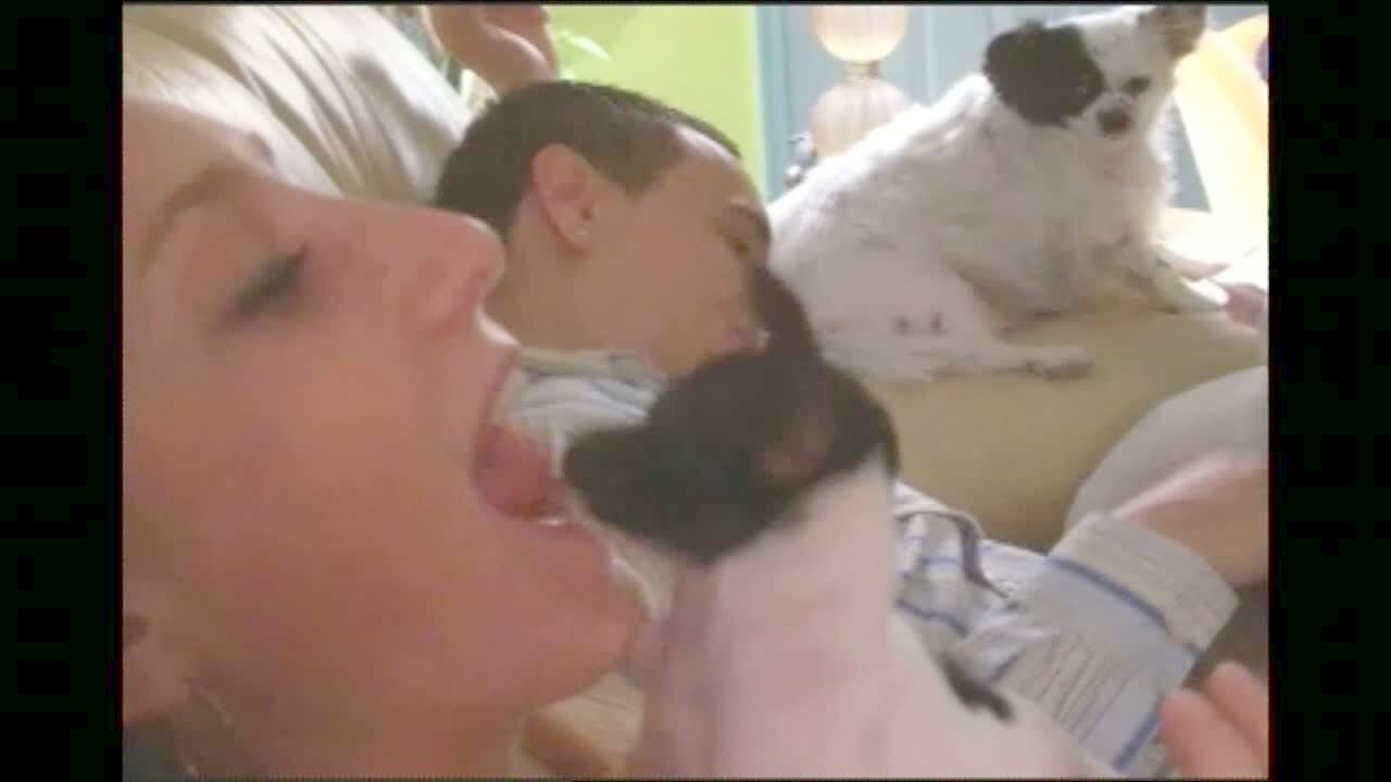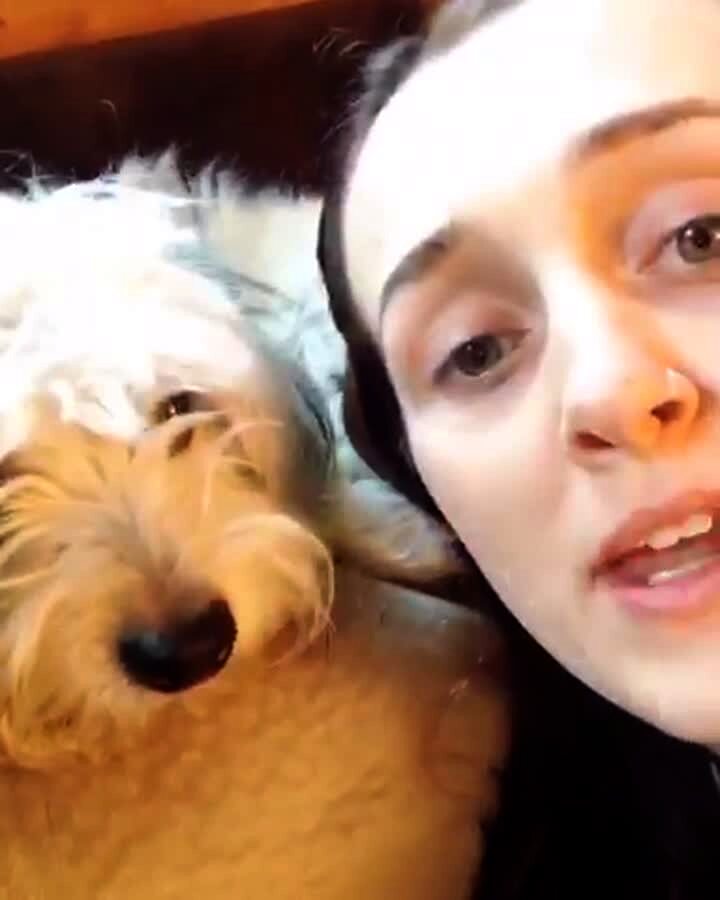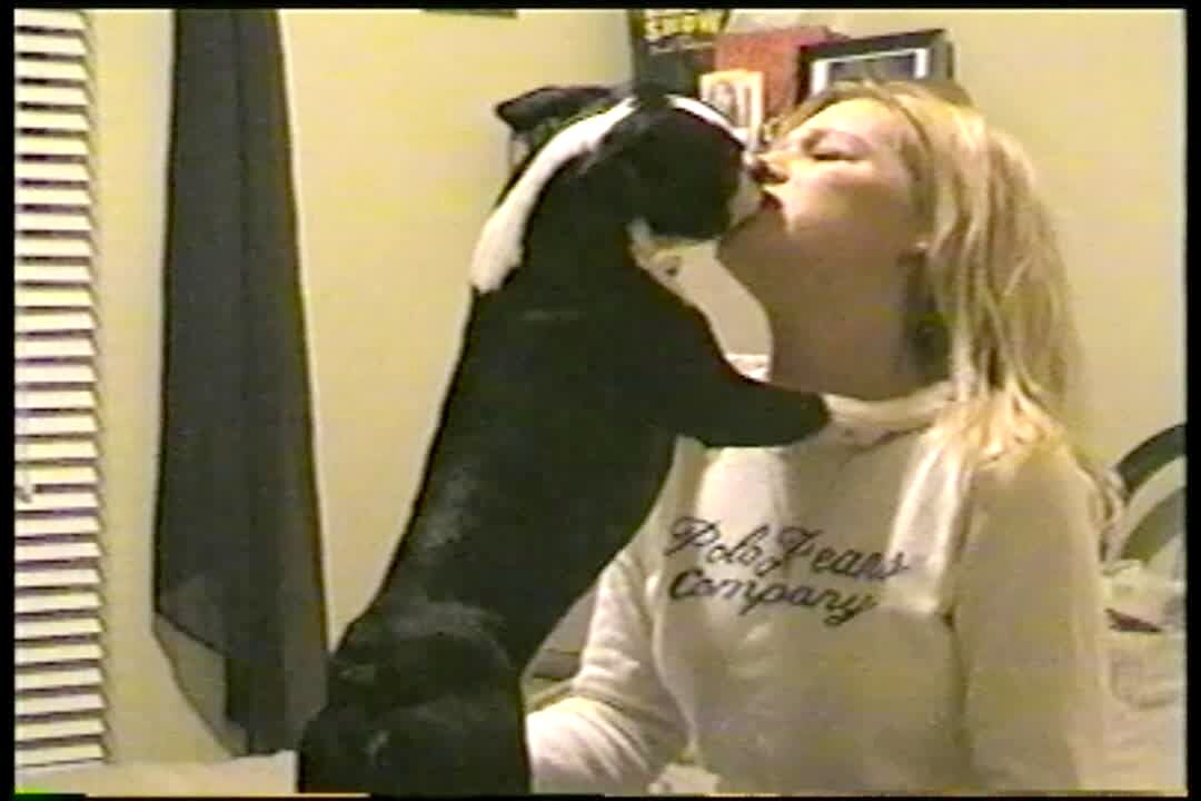 Woman sings. Her dog licks her face. Then the dog puts its entire head in her mouth and licks her. Gross