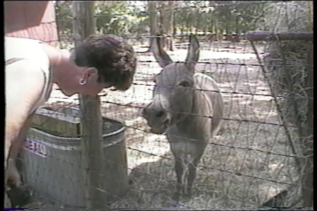 Woman CROUCHES NEXT TO DONKEY PEN MAKING DONKEY NOISES, DONKEY REPLIES IN KIND